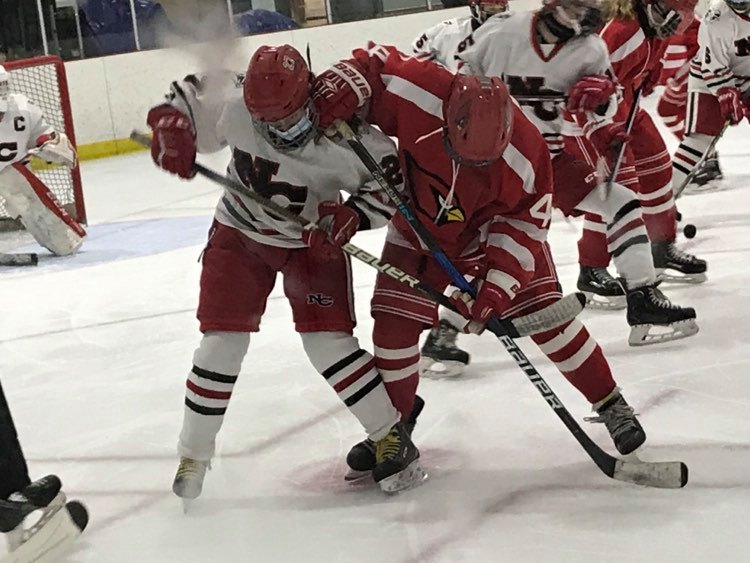 In the team’s first meeting of the season on Tuesday at Greenwich’s Dorothy Hamill Skating Rink, New Canaan scored one goal early in the first period, then added a second tally late in the third period, after Cardinals goalie Hannah Goldenberg made a wealth of saves.