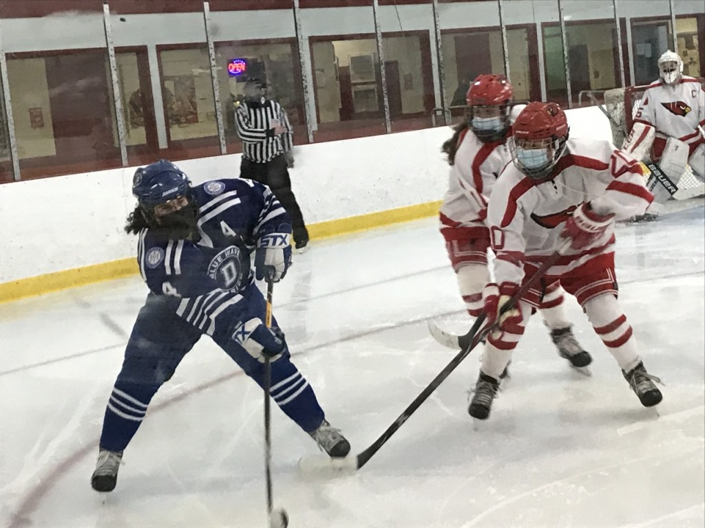 Greenwich took a 1-0 lead with 10:05 remaining in the first period. Delaney Roth controlled the puck along the boards in Greenwich’s zone off a faceoff, skated down the left side of the ice and slid the puck across to her sister Sophie. Cutting hard toward the net, Sophie Roth, got her stick on her sister’s pass and directed the puck past Darien junior goalie Claire Haupt, giving the Cardinals a 1-0 lead. Haupt shared the goalkeeping duties with junior Ella Whitticom for Darien.