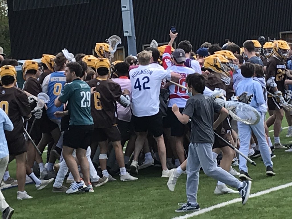 Photo by David Fierro: The Brunswick lacrosse team celebrates its win against Taft School with its fans after the game.