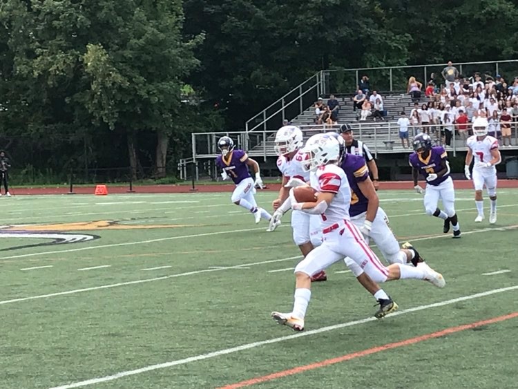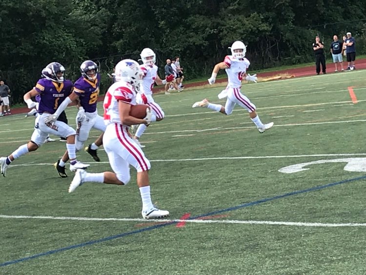 “That’s any player’s dream, especially on the D-Line.,” Doyle said of his pick six. “I was telling the coaches I was hoping to haul one in today and I got it, thanks to the other linemen putting on the pressure. We had two touchdowns on defense and another two turnovers. It felt amazing to be back on the field. I think our Greenwich defense is going to be something.”