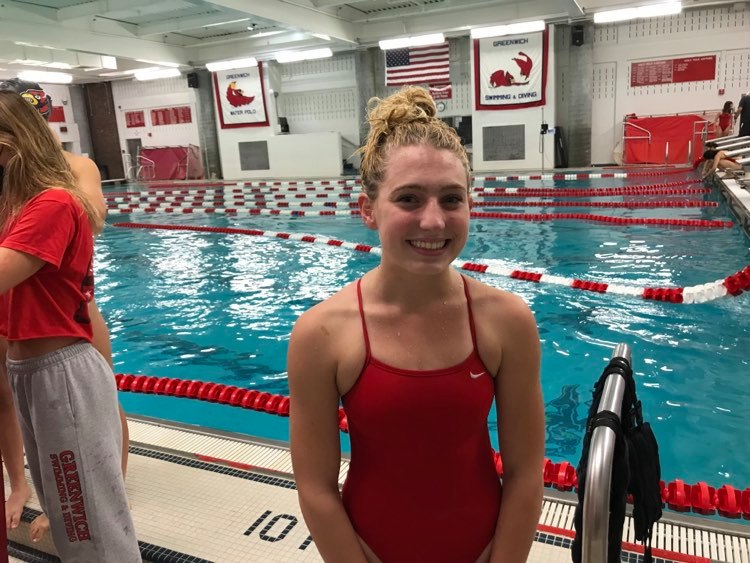 Said Greenwich’s Bella Malchow, also a senior captain: “Senior Night is great, we’re doing a ceremony right now and our senior class is so close, we’ve grown up together. The whole team atmosphere is great, so it was very fun today to keep our attitude up and keep cheering. It’s a great end to the dual meet season.”