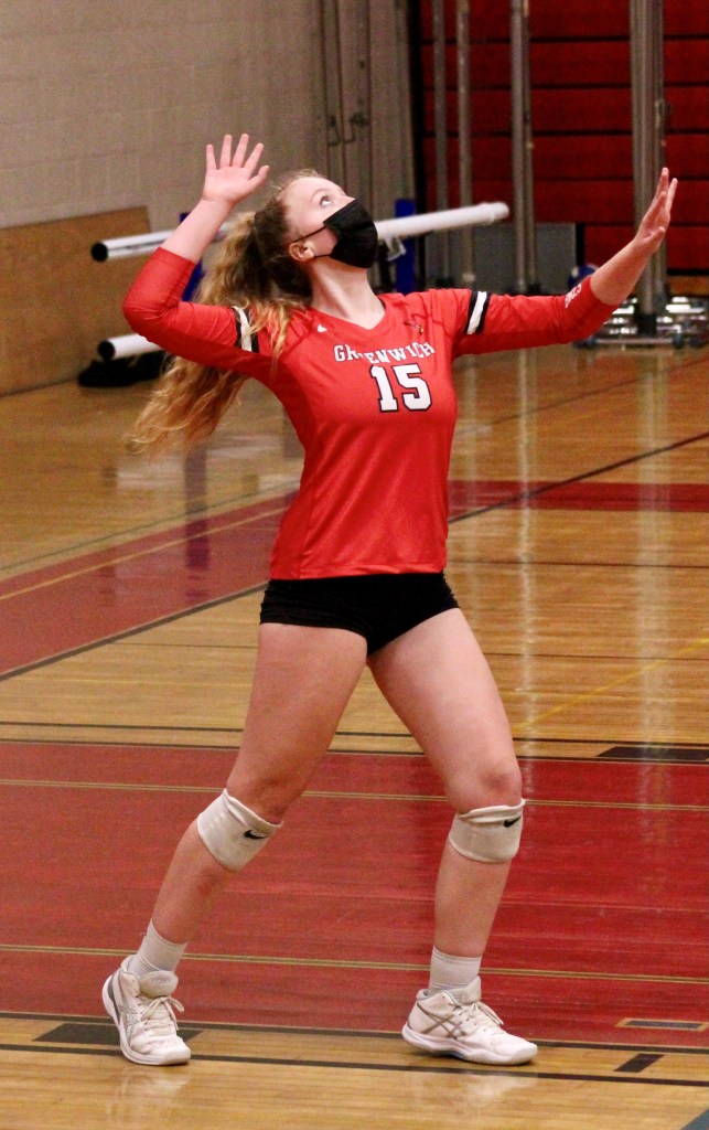 Photo by Cindy Saleeby: Adele Sotgiu gets ready to return a shot during a recent home match for the Greenwich girls volleyball team.