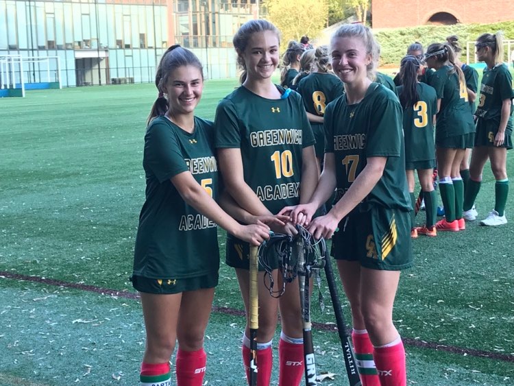 Jordan Pittignano, left, Elizabeth Dale and Cameron Brower helped lead Greenwich Academy’s field hockey team as senior captains. GA made it to the FAA Tournament finals, then advanced to the NEPSAC Class A Tournament semifinals.
