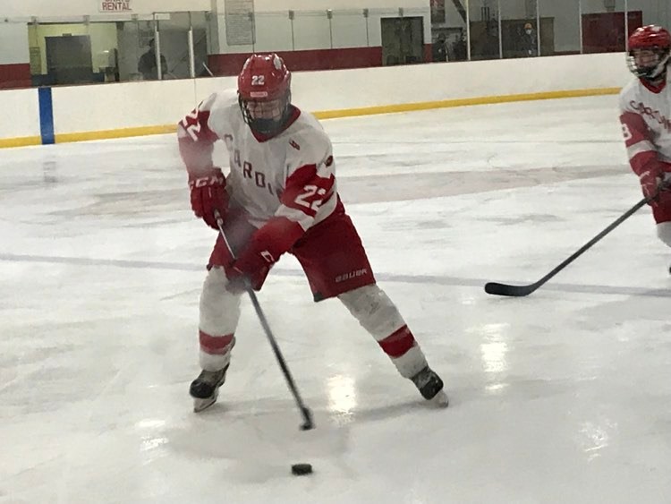 The Cards seized a 1-0 lead with 7:57 remaining in the first period. Possessing the puck at the point, junior defenseman Owen Lanzarone slid the puck to Feda, who from just outside the right faceoff circle, slapped a shot past Adams, giving Greenwich a 1-0 advantage.