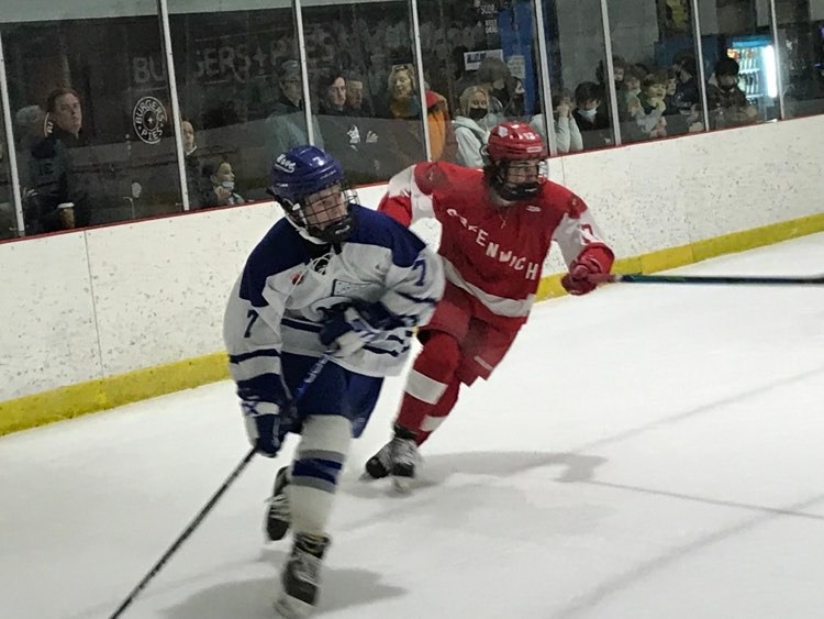 It didn’t take long for Darien to stretch its lead in the third period. Just 37 seconds into the period Kreppein scored off a rush up the ice, putting Greenwich in a 3-0 hole. Devillers scored off a rebound with an assist going to Pfeifle with 6:48 remaining in the third period and the same combination struck again at the 4:43 mark, with this time, Devillers connecting on a shot from between the circles, giving the Blue Wave a 5-0 lead.