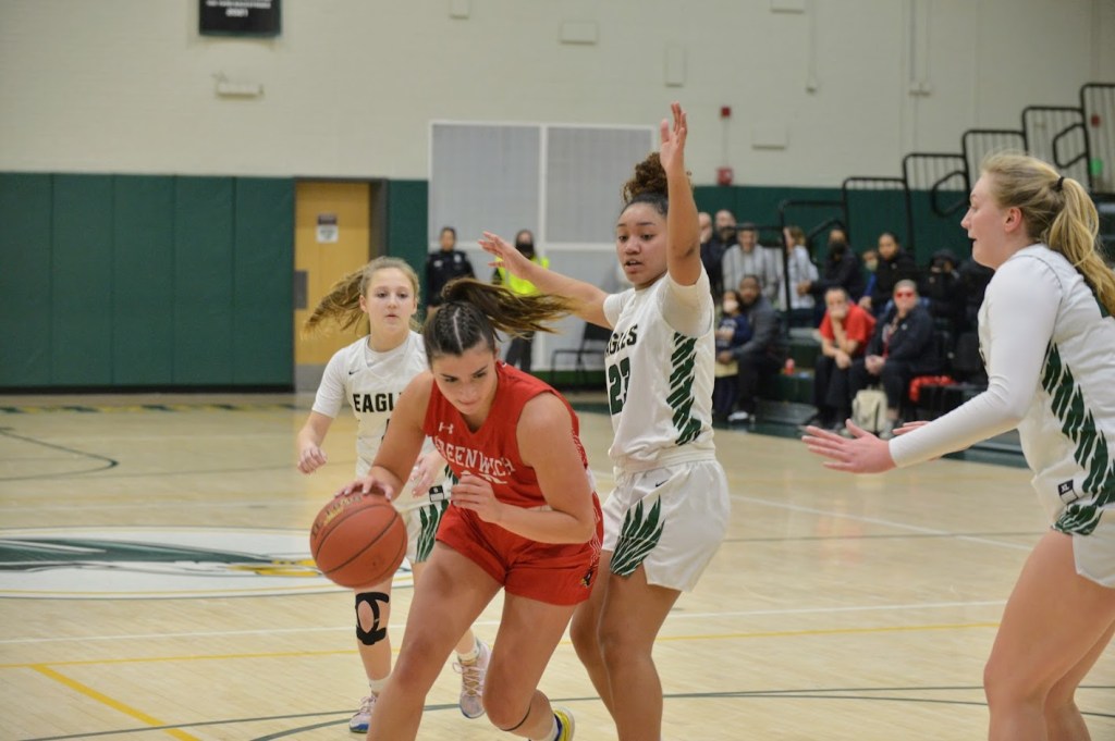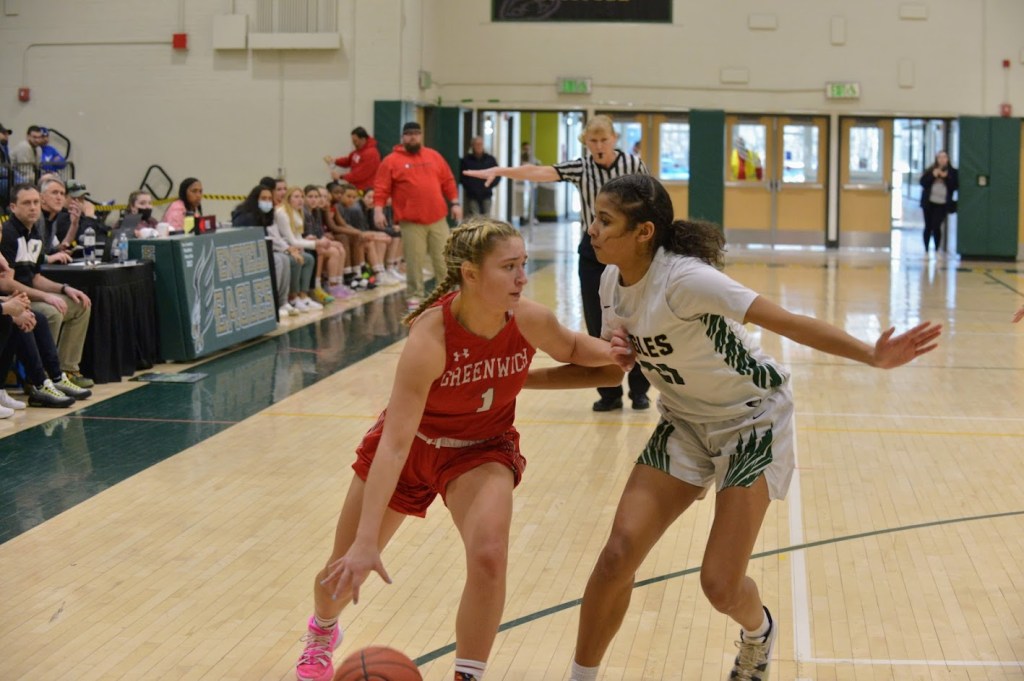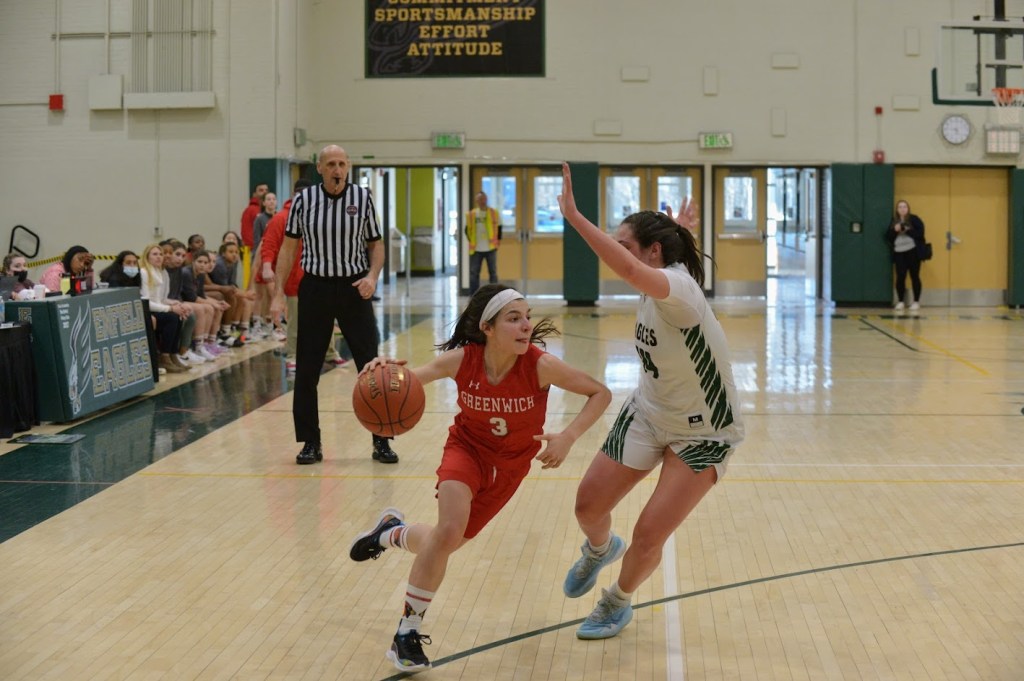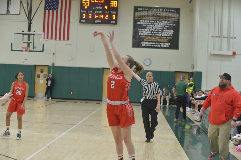 The home team jumped out to a 6-0 lead, but Greenwich scored seven straight points, behind three points from Sergio, a basket in the post by senior forward Kayla Anderson and a layup off a steal from Frankle. Sergio swished a 3-pointer, giving GHS a 10-8 edge going into the second quarter.