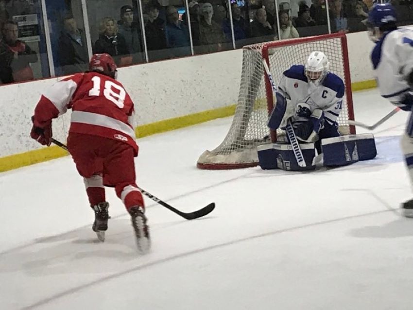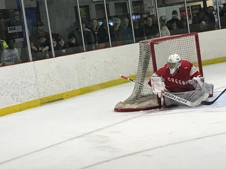 The Cards had one of the game’s first scoring opportunities and narrowly missed scoring the opening goal. Greenwich senior defenseman Brendan Frost slapped a shot from just below the blue line that hit the crossbar 50 seconds into the first period. Schofield made a 1-on-1 save off a shot from close in by senior forward Daniel Greenbaum and senior forward Danny Pratley directed a shot toward Schofield from the right wing. Studwell, meanwhile, made eight saves for the Cardinals during the first period.