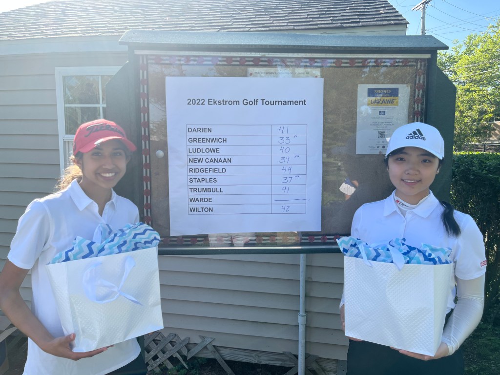 In junior varsity girls golf action, Greenwich won the Ekstrom Par 3 Tournament at Carl Dickman Golf Course in Fairfield. Junior Cici Ge and sophomore Bella Crasto played in the best ball format and shot 33, good for first place. Also, Bella won the long drive award and Cici won closest to the pin award.