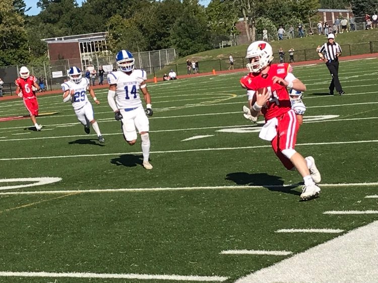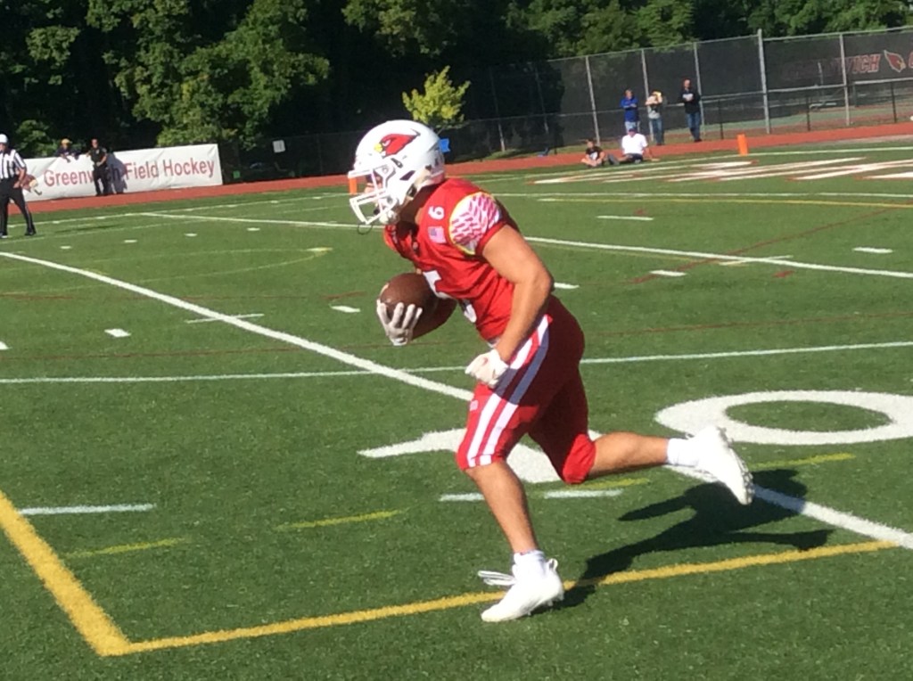 The game couldn’t have had a better start to it for Greenwich, which came back from a 21-point deficit to beat Ridgefield a week ago, 49-42. On the matchup’s first possession, Wilson dropped back to pass and threw a 60-yard touchdown pass to senior wide receiver James Wailgum, who got behind Southington’s secondary. Senior Sergot Boone kicked the extra point and the Cardinals took a 7-0 advantage with 9:07 left in the opening quarter.