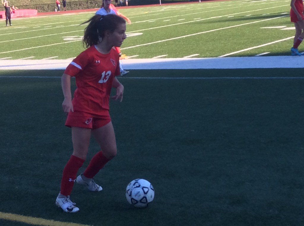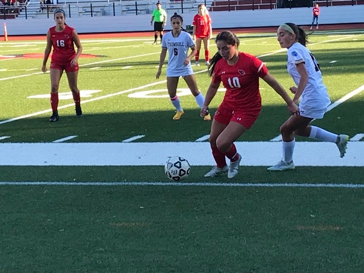 Junior forward Emma Abbazia helped power Greenwich in the opening half. After Trumbull senior Megan Garritty nearly scored on a free kick with 35:05 remaining in the first half, the Cards scored 5:57 later. Receiving a pass from junior forward Julia Acosta, Abbazia converted a shot from the left shot, directing the ball inside the right post to give GHS a 1-0 edge.