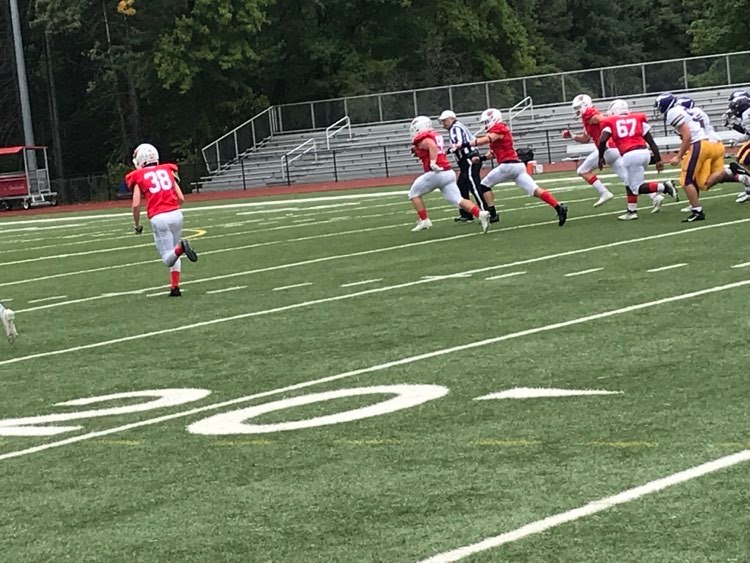 The Vikings moved the ball to the Cards’ 15-yard line on their opening possession of the second quarter, behind a pair of receptions for first downs by senior wide receiver/defensive back David Moodie. Yet the visitors drive was halted when Insinga recorded a sack on Westhill’s quarterback, resulting in a fumble. Junior defensive lineman Ignacy Pietryka alertly picked up the fumble and returned it approximately 75 yards for his first varsity career touchdown, extending the Cardinals advantage to 42-0.