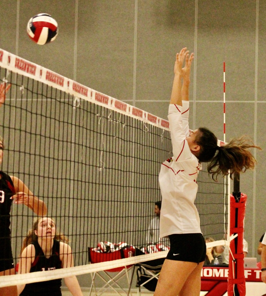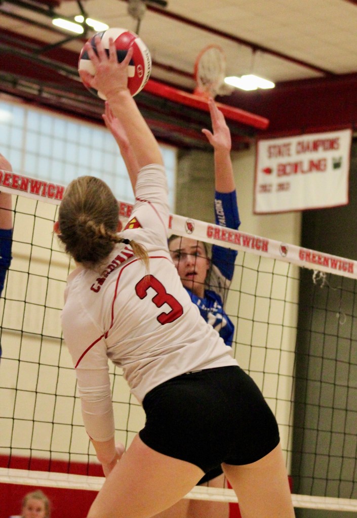 Photo by Cindy Saleeby: Greenwich senior Maggie Saleeby executes a kill during a match vs. Fairfield Warde.