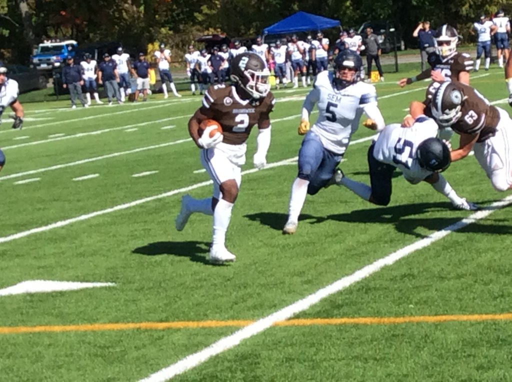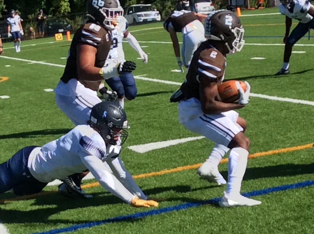 On the ensuing kickoff by sophomore Oliver Reynolds, Wyoming Seminary fumbled and Bruins senior Wiley Ocken recovered it, giving the home team the ball at the visitors’ 19-yard line. It took only one play for Brunswick to cash in on their opportunity. Junior quarterback Elijah Cromartie connected with Davis on a screen pass and Davis dashed into the end zone for a 17-yard score, making it 14-0 at the 11:39 mark of the second quarter – only 14 seconds after the game’s first TD.