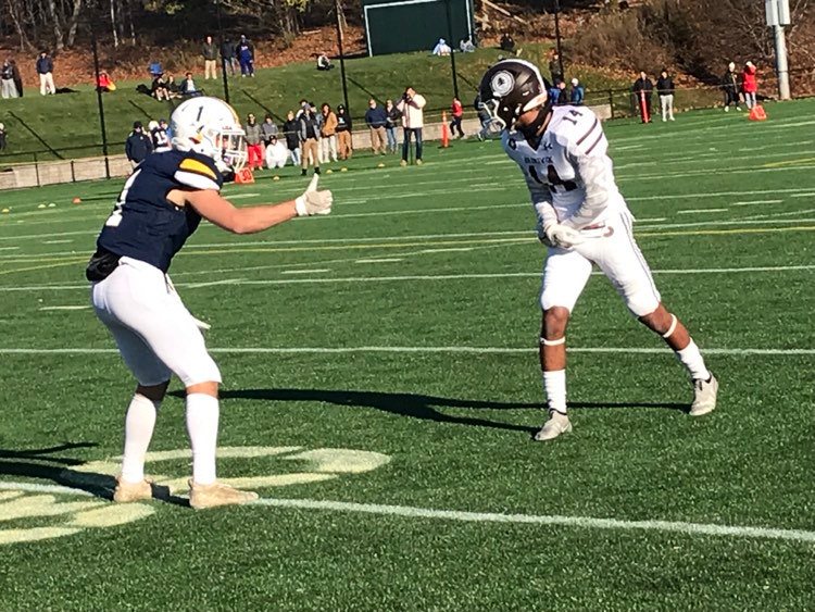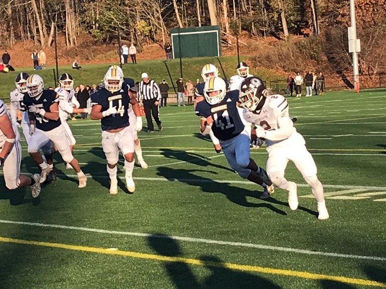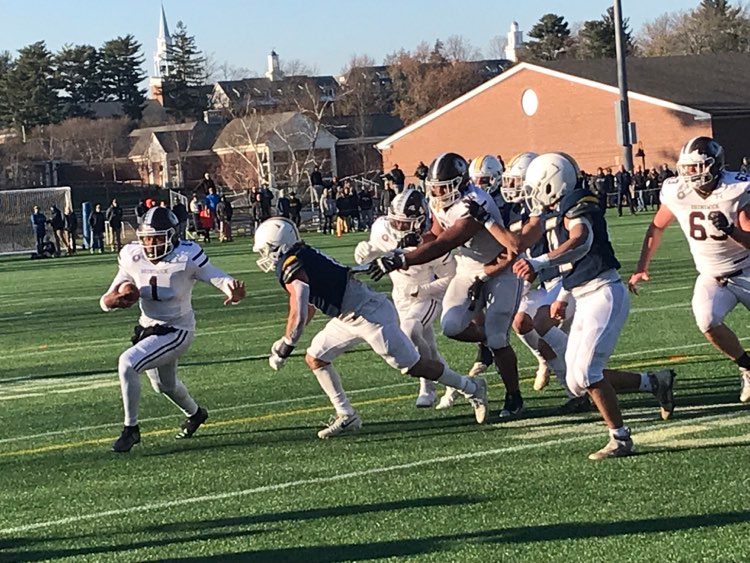Coached by LJ Spinnato, Choate Rosemary Hall closed to within 20-14 and had the momentum going into halftime. They cut into the Bruins’ once 20-point lead by receiving a 10-yard touchdown run by senior running back Jon Marvan and 52-yard touchdown reception by senior wideout Seth Sweitzer off a pass from junior quarterback Nick Rubino, who relieved Carroll at QB.