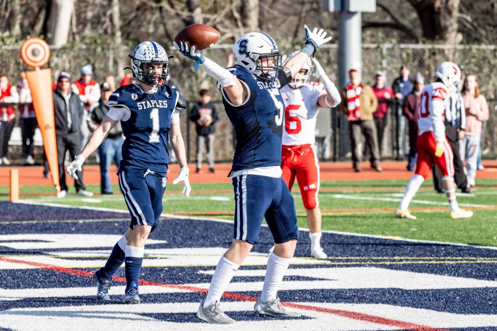 Quarterback Caleb Smith’s 11-yard touchdown pass to Will Holleman with 1:06 remaining in the fourth quarter, followed by Jack McColl’s successful point-after-attempt, lifted Staples to a hard-fought 39-38 comeback win over visiting Greenwich in the regular season finale for both squads.