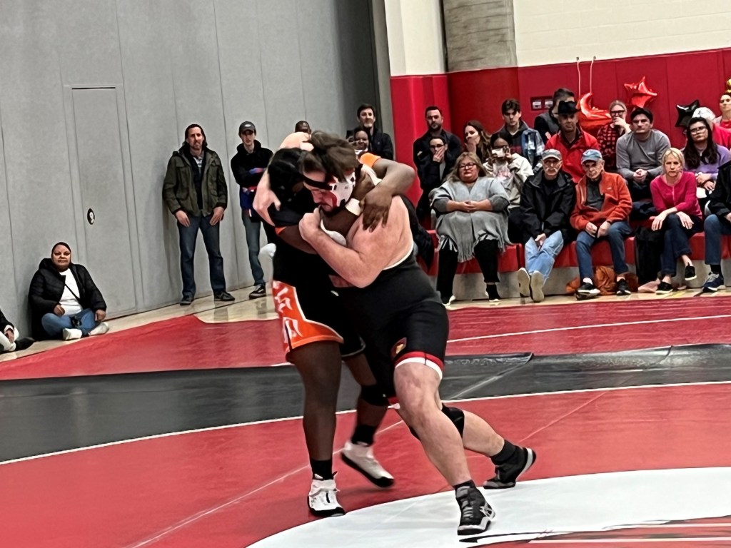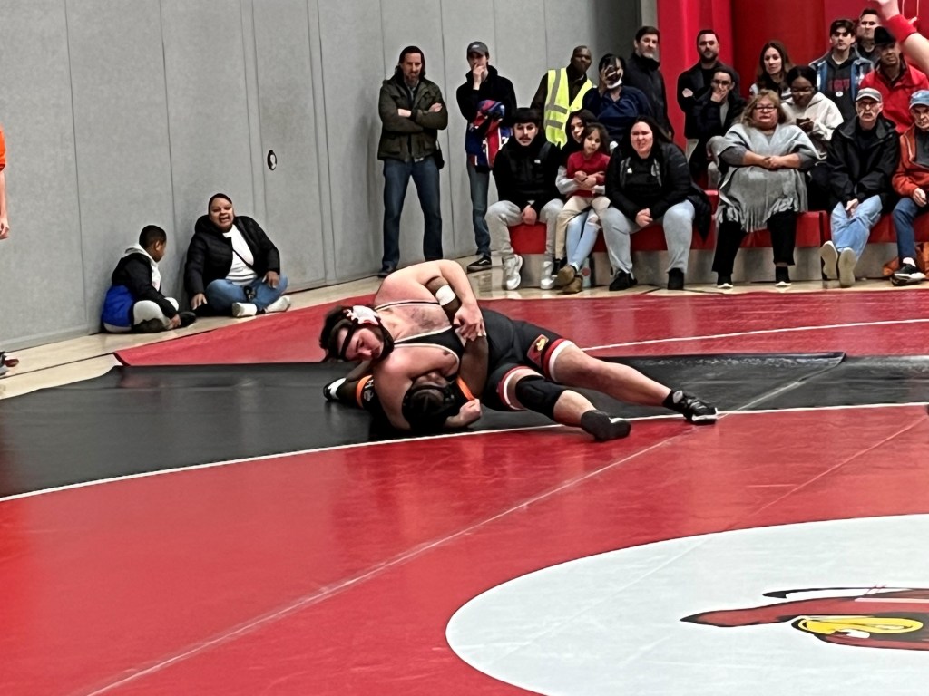 Greenwich senior Ray Ruggiero competed at 182 and was pinned in the second period against his formidable Stamford opponent, while freshman Colin Falla, Drew’s brother, scored a pinfall triumph for GHS in the 193-pound match.