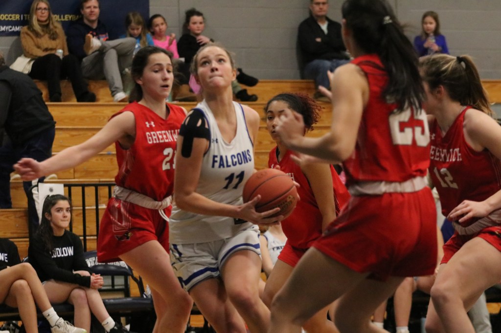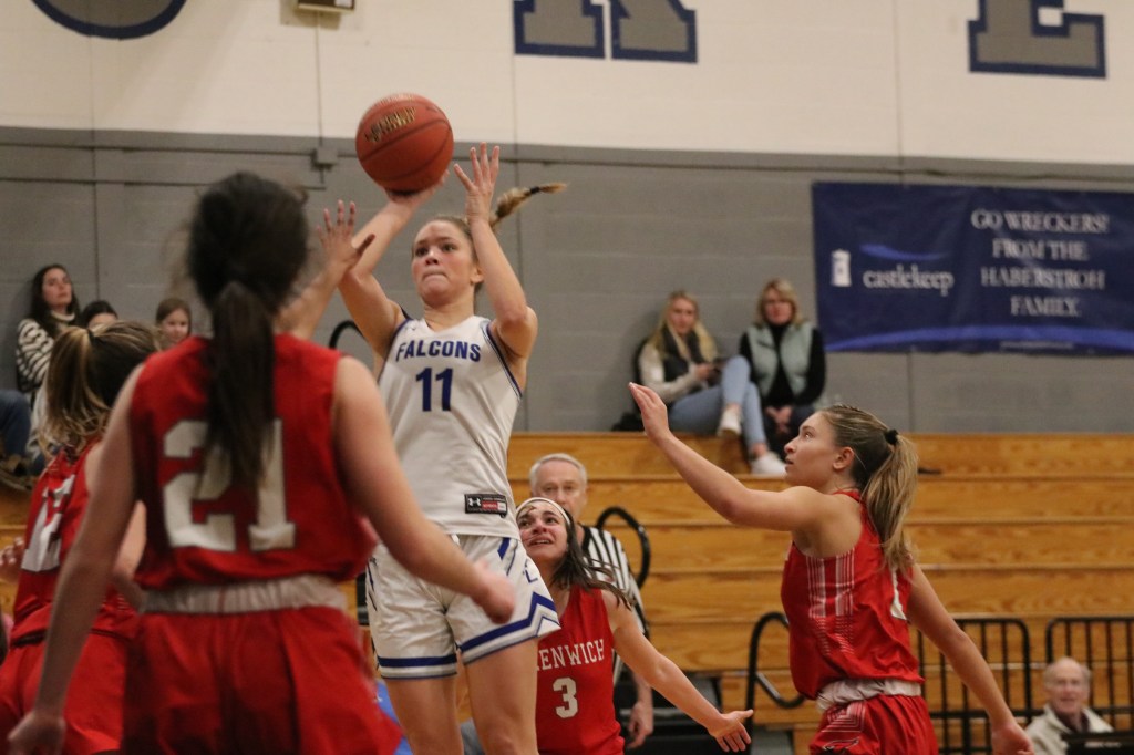 Shostak got the Falcons rolling, converting a 3-pointer from the left side against Greenwich’s 2-3 zone on one of the game’s first possessions. Sommers grabbed an offensive rebound and scored, then Shostak converted a fastbreak layup off a steal, giving Ludlowe an 8-0 lead 1:03 into the first quarter.
