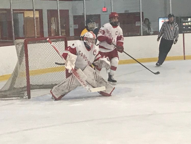 Capitalizing on a 2-on-1 Ridgefield scored shortly after the opening faceoff, taking a 1-0 lead just 20 seconds into the first period. Approximately two minutes later, the Cardinals evened the score. Junior Bailey Rozmus scored off a pass from senior Derek D’Angelo, tying the score at 1-1. Logan Carino, a senior, also helped set up the equalizer.