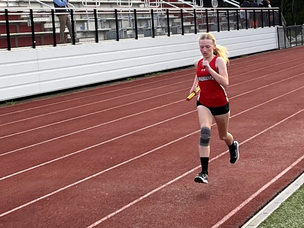 Eliana Daplyn, a freshman, ran a personal-record time of 2:32.95 in winning the 800-meter race for GHS. Orla Muir, also a freshman, placed second for the Cards in 2:33.52.