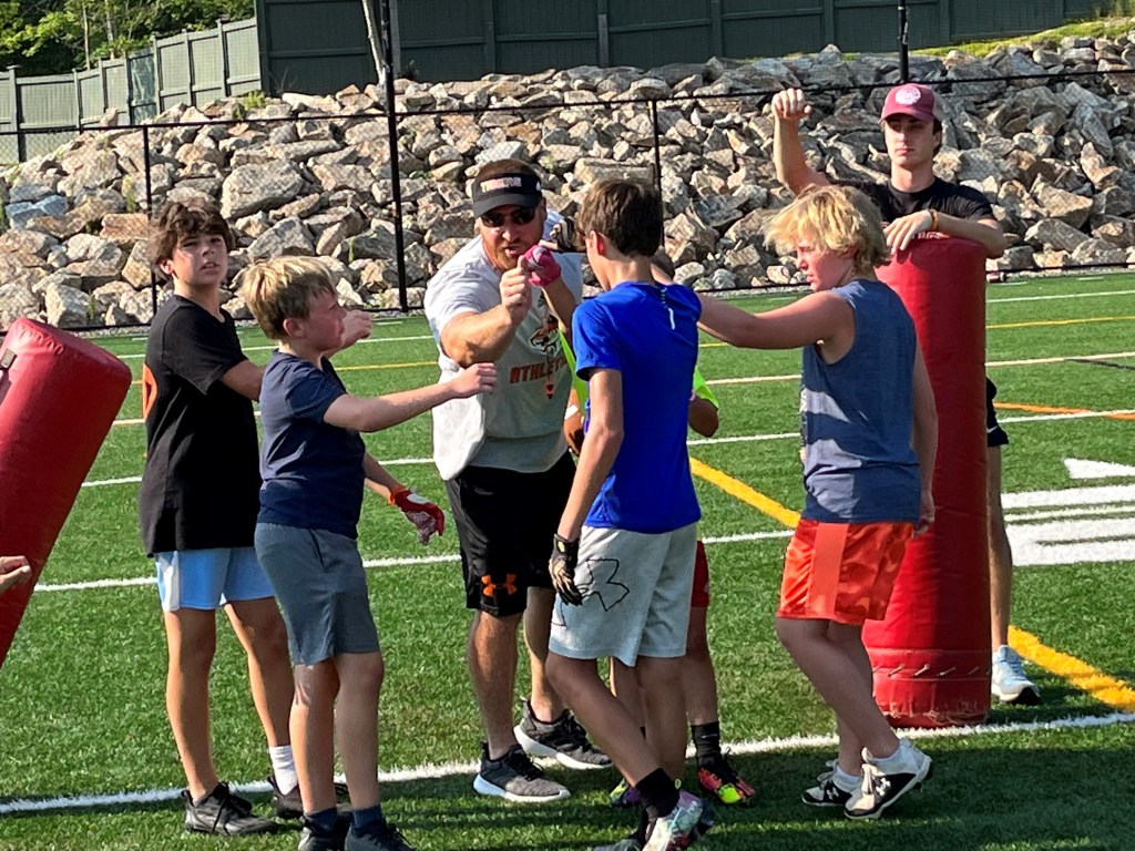 From 4:30 p.m.-7:30 p.m. this past Monday to Wednesday, the young athletes (elementary to middle school kids) honed their quarterback skills, learned the nuances of playing wide receiver, and received instruction on blocking and tackling, under the direction of Greenwich Country Day School head varsity football coach Kevin Avery, Tigers assistant coaches, current GCDS varsity football players and of course, the camp’s special visitor, former NFL player Matt Simms.