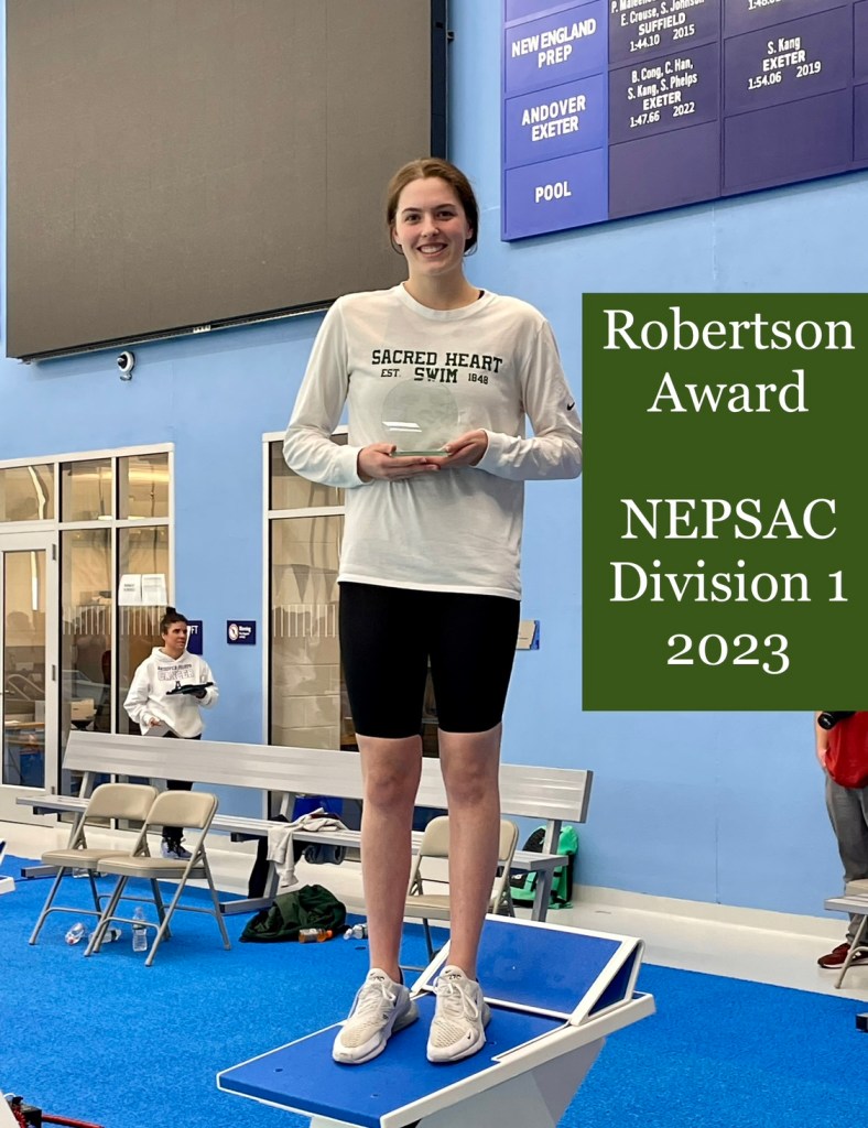 Following the NEPASAC Division I championship meet this past March, Bastone was presented with the prestigious NEPSAC Division I 2023 Robertson Award. For the Robertson Award, coaches vote at the championships for outstanding student-athletes in each division who best exemplify the values of New England Prep School Swimming and Diving.