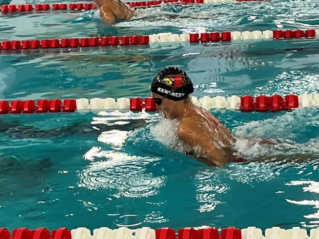 Pacing the Cardinals to their early-season win against one of their rivals were seniors Sydney Jee and Payton Foster, both of whom won two individual events. Jee, who will continue her swimming career at Bucknell University next year, is one of the Cards’ four senior captains.