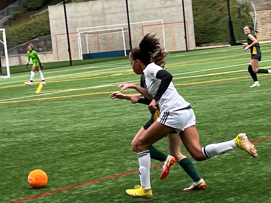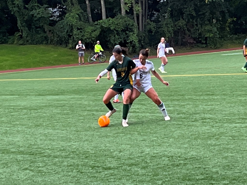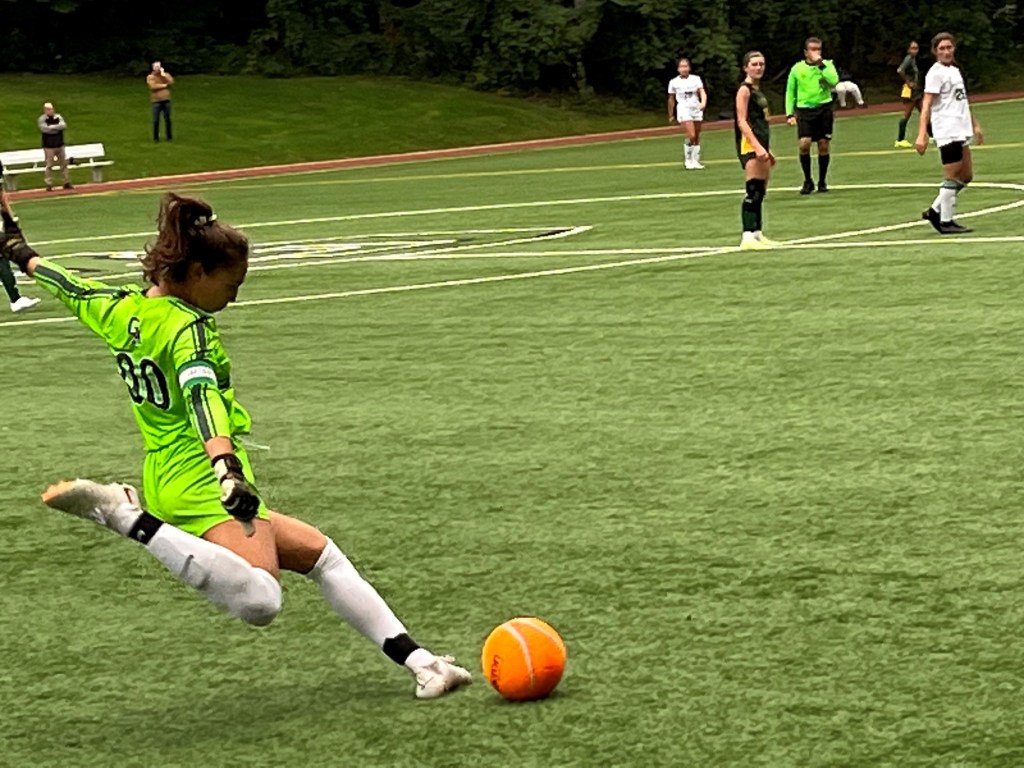 Greenwich Academy’s best chances in the first half came on a pair of free kicks by senior Lola Tirabassi, one occurring in the 27th minute, the other coming 10 minutes later. Sophomore goalie Olivia Figueiredo kept the Tigers in front, then made a save on a shot late in the first half on a nice connection from GA’s Ruby Montanez and Maggie Whidden.
