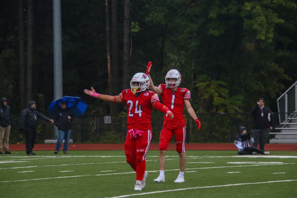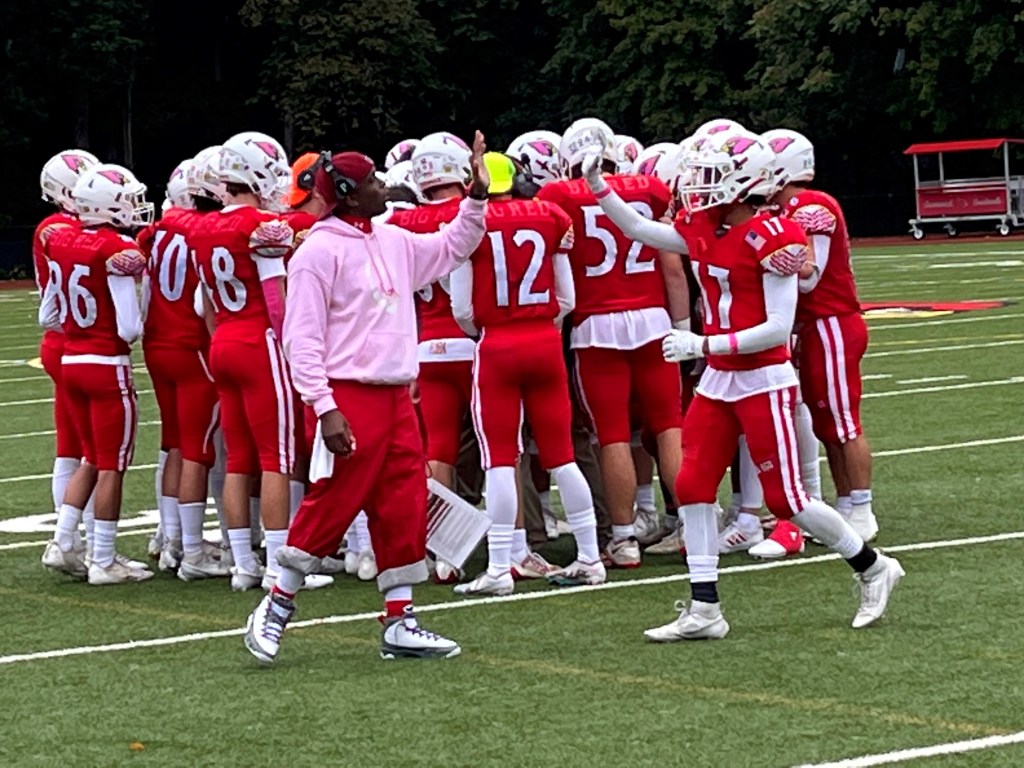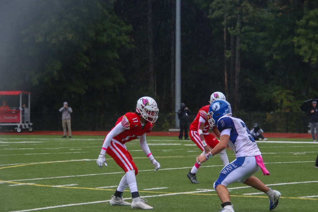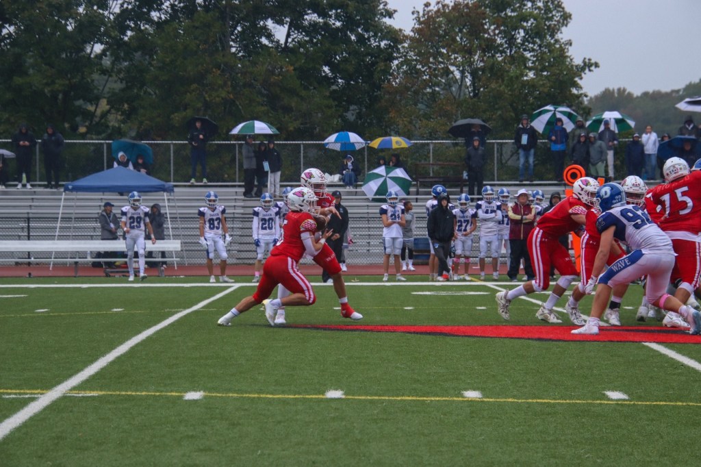 Meanwhile, Greenwich’s defense, which shutout Danbury in its previous game, was on point once again. Linebackers John Insinga, Sebastian Parra and Jaden Scott, all seniors, made it difficult for the Blue Wave to get their running game going. Up front, senior defensive linemen Ignacy Pietryka, Yahcere Mcghee and Logan Jozwiak made their presence felt for the Cardinals throughout this physical matchup.
