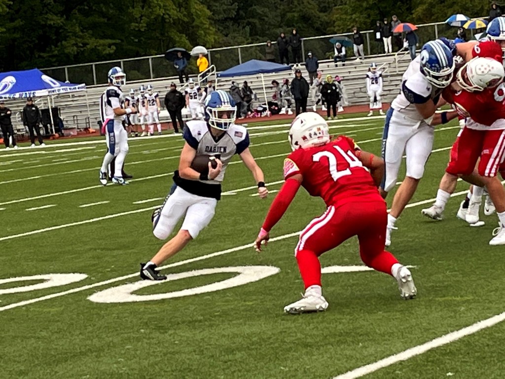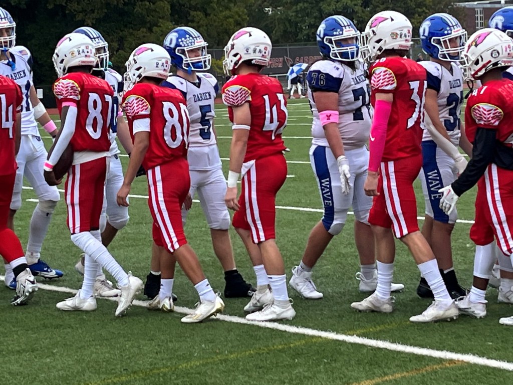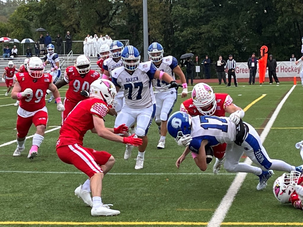 Morello was especially impressed with how his team’s secondary covered Darien’s big, tall receivers. Blue Wave junior Kevin Roche stands 6-foot-8. His teammate, Charlie Thom, a senior, is 6-6.
