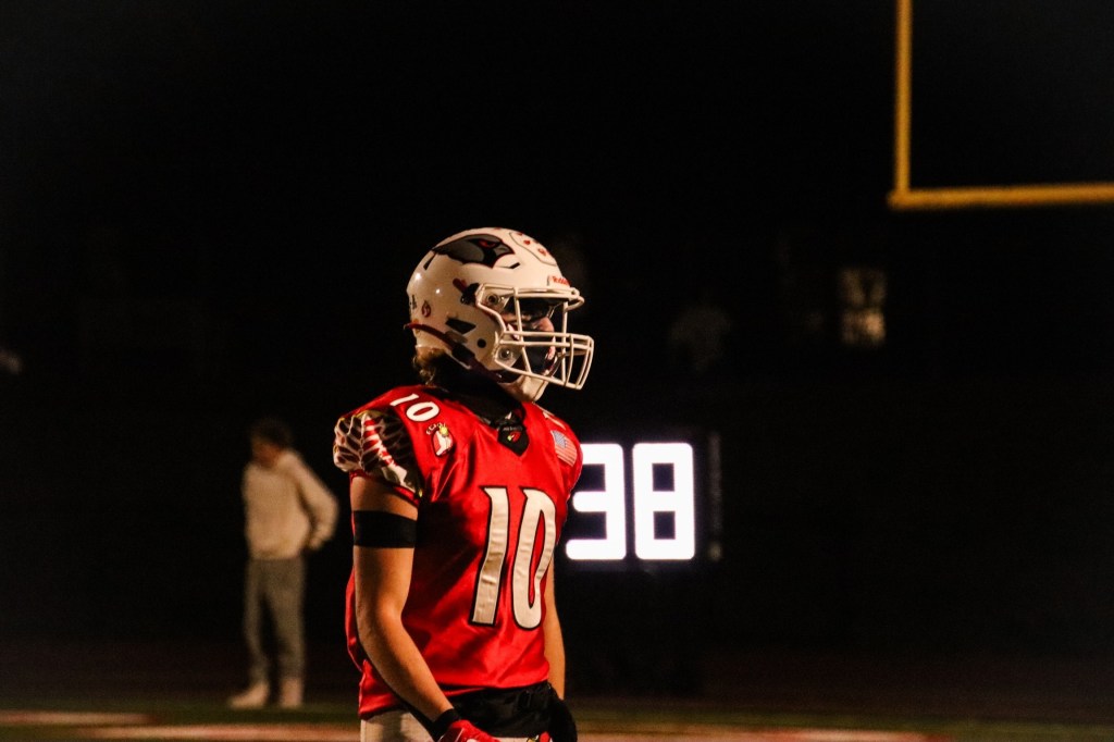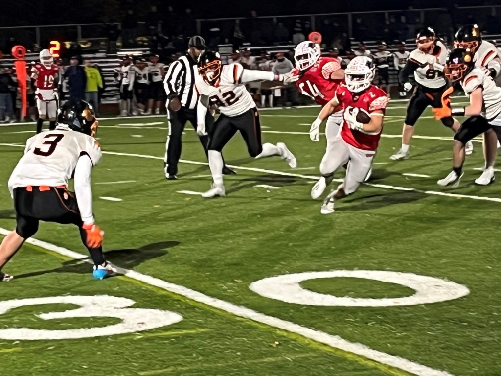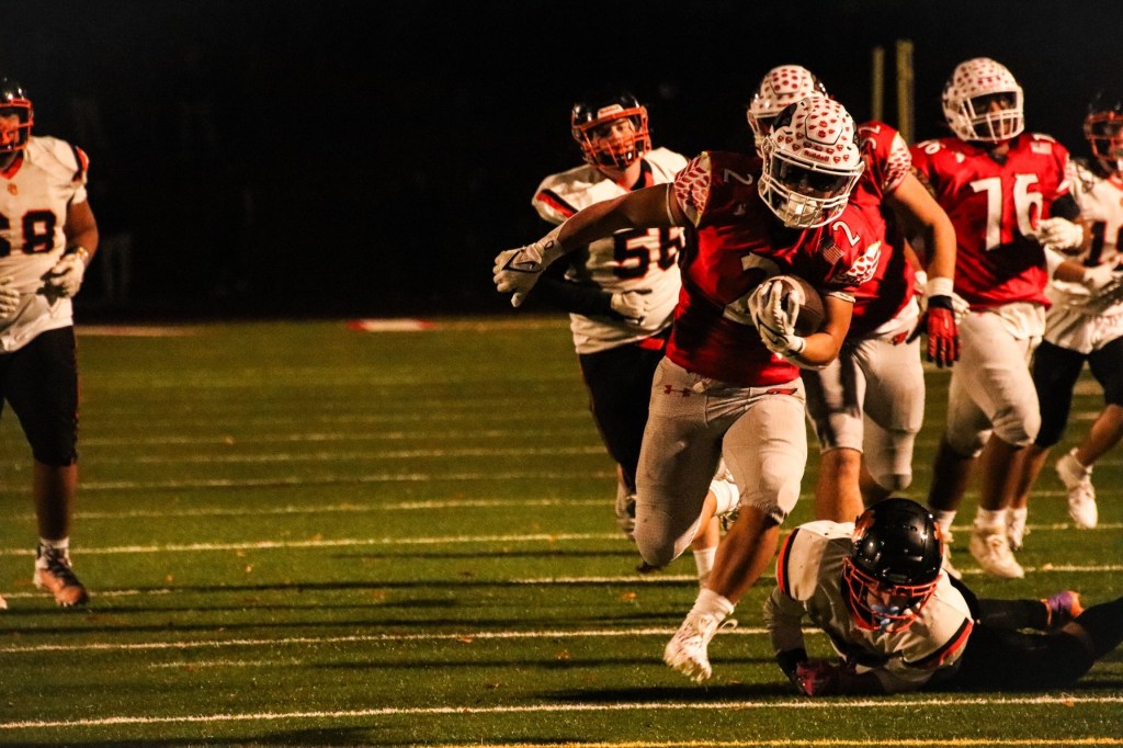 At the 6:40 mark of the second quarter, Kim scored on a 10-yard run. Senior Erick Perino kicked the extra point, putting the Cardinals on top, 14-0. A 54-yard run down the left sideline by Kim, keyed the Cards’ long scoring drive. Gennarelli’s reception for a first down off a Grillo pass, also sparked the home team’s scoring march.