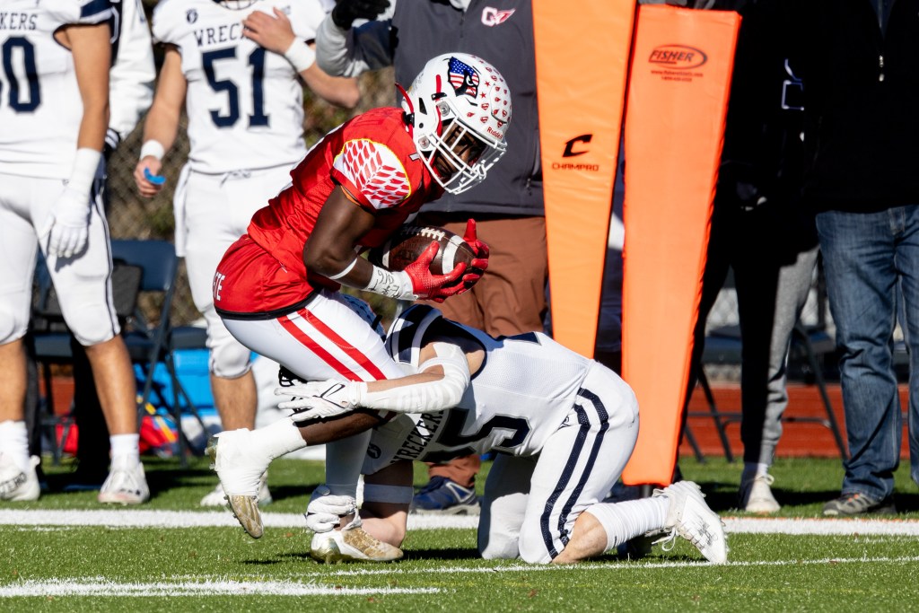 Photo courtesy of Dylan Goodman: Greenwich wide receiver Brandon Auguste looks to escape the tackle of Staples defensive back Sam DiGiovanni during a Thanksgiving Day football game at Cardinal Stadium.