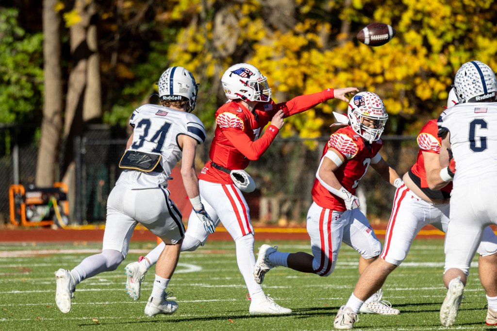 Photo by Dylan Goodman: Greenwich quarterback Rocco Grillo throws a pass while being pursued by Staples’ Luke Goldman at Cardinal Stadium. Greenwich lost, 24-13.