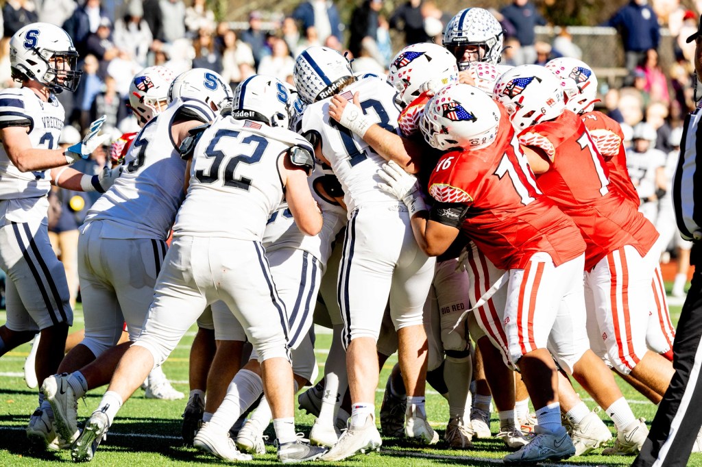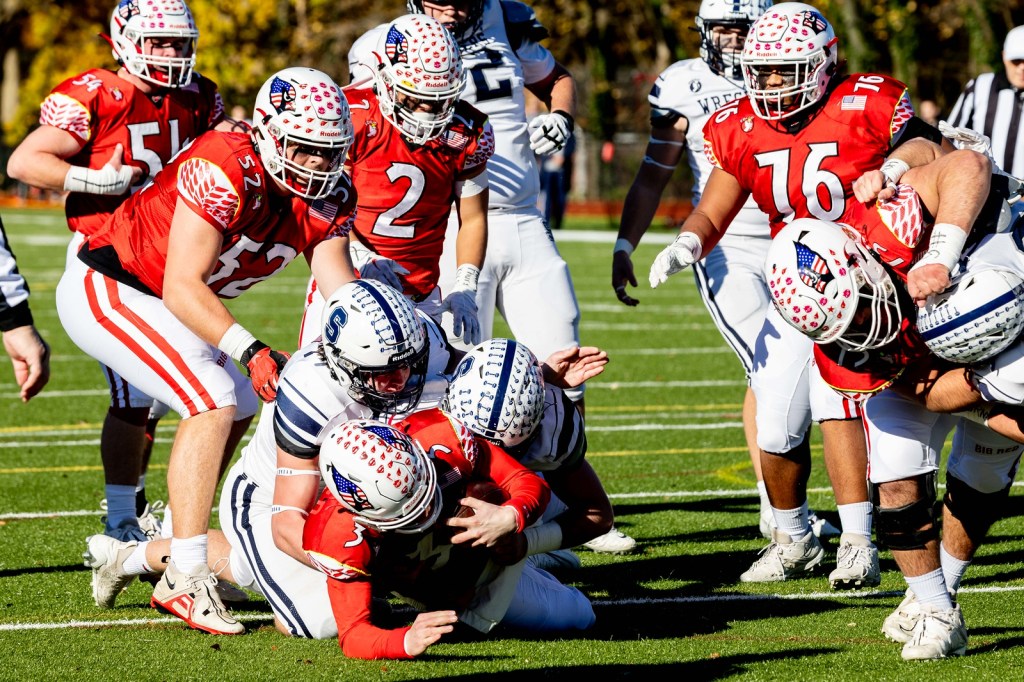 Photo courtesy of Dylan Goodman Photography: Staples’ defensive line attempts to stop Greenwich from gaining a first down on a running play on Nov. 23, 2023, at Cardinal Stadium.