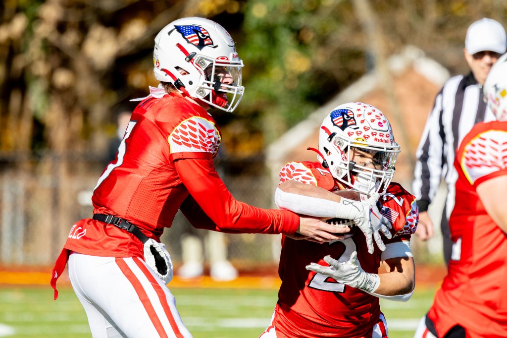 Photo courtesy of Dylan Goodman Photography: Cardinals senior quarterback Rocco Grillo hands the ball off to senior running back Ian Kim against the Wreckers. The Cardinals will host a CIAC Class LL playoff game on Tuesday.