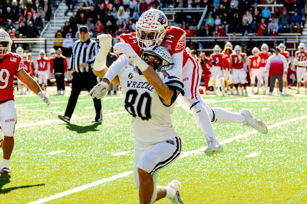 Photo by Dylan Goodman: The Cardinals’ defensive line duels the Wreckers’ offensive line during FCIAC football action.