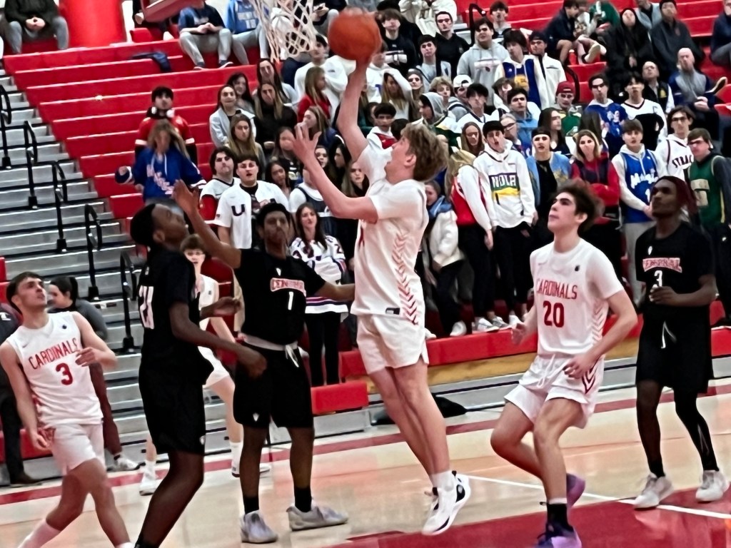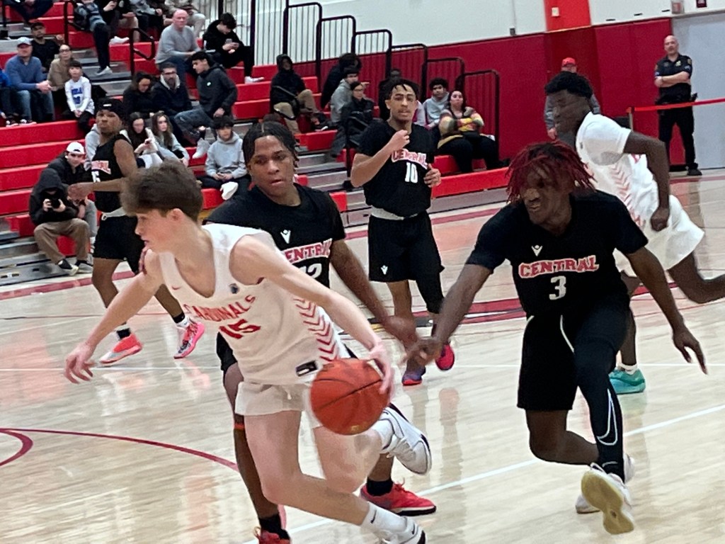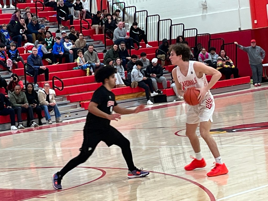 Receiving a career-high 20 points from sophomore forward Sandro Scott and a 13-point effort from senior co-captain Connor Parkes, Greenwich led throughout in its 50-39 win over Central. The victory before their big home crowd, lifted the Cardinals’ record to 3-6 overall.