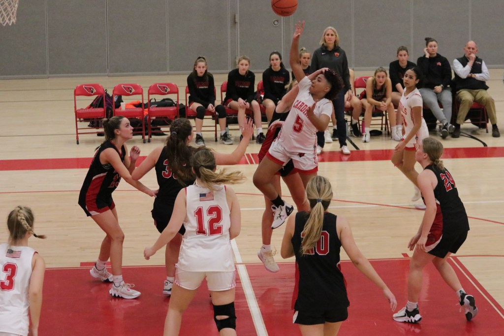 Ahead by six points after the first quarter, the Rams took a 10-2 advantage on Ognibene’s basket from the post in the opening minute of the second quarter. Later in the second quarter, a 3-pointer by forward Ceci Patterson put the visitors on top, 15-8. Utzinger then led the Cardinals back with her standout shooting. She swished consecutive shots from beyond the arc, pulling GHS to within, 15-14 at the 2:35 mark of the second quarter. A runner from the baseline from Utzinger put the hosts ahead, 16-15 in the final minute of the second quarter.