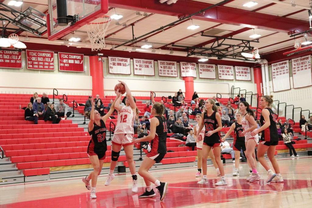 New Canaan (7-5, 4-4 FCIAC) was paced by 12 points from Ognibene and 12 points by guard Fiona Mueller, who also converted two 3-point shots. Ognibene had eight first-half points, enabling the Rams to take advantages of 10-2 and 15-8. The Rams’ center was a tough matchup for the Cards, double-teamed when they could and relied on Xhekaj, Monteiro and junior forward Kate Baxendale for strong defense in the low post. Greenwich mostly played man-to-man defense against New Canaan.