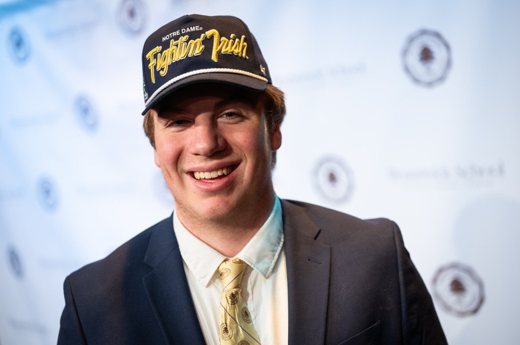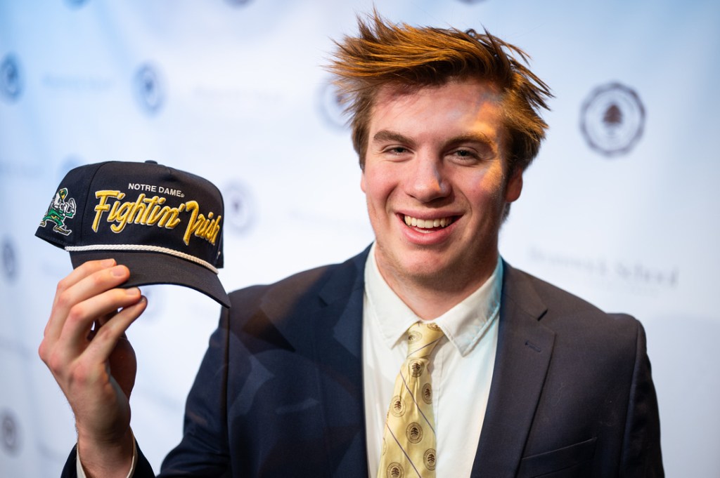 After announcing his commitment to Notre Dame, Augustine put on the Notre Dame Fightin’ Irish baseball hat, as the gathering enthusiastically applauded.