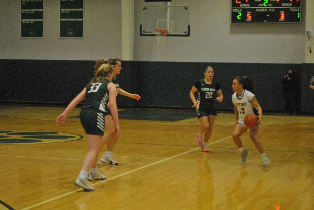 The Tigers steadily built their lead during the pivotal second quarter, outscoring the Gators, 18-3. Parrotta’s layup gave the home team the lead for good at 13-11, then Sfreddo scored in transition, making it 15-11. Baskets by senior guard Victoria Hart and Matthews capped a 16-0 Sacred Heart spurt, giving them a 27-11 advantage.