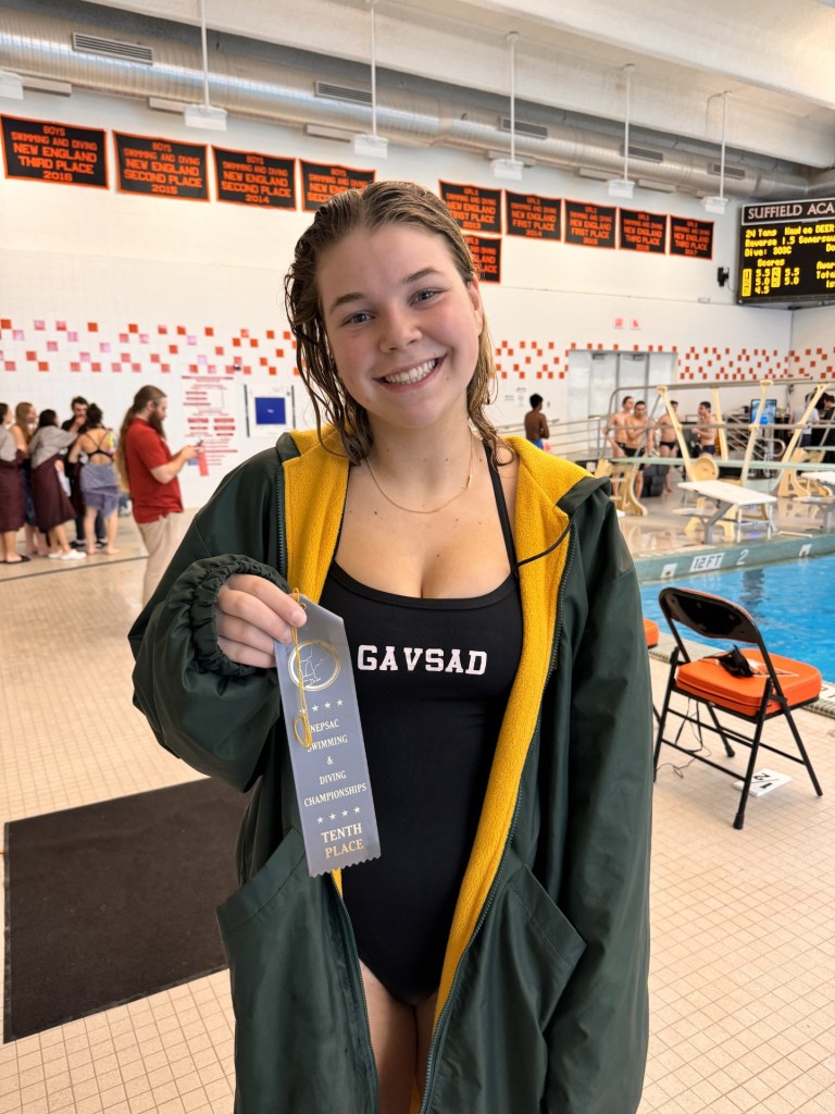 Wu’s sensational diving performance on Thursday at Suffield Academy also set a NEPSSA Division I meet record and established a pool record at Suffield Academy. So, three records were broken by Wu with her outstanding 11-round routine at the championship meet.