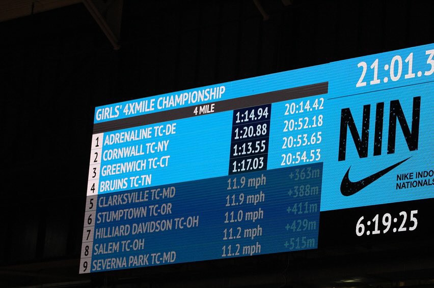 In the 4xMile relay race at the Nike Nationals, Adrenaline Track Club from Delaware recorded a first-place finish, clocking in at 20:14.42.