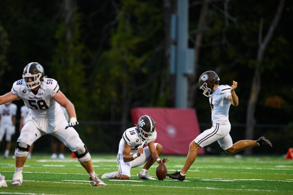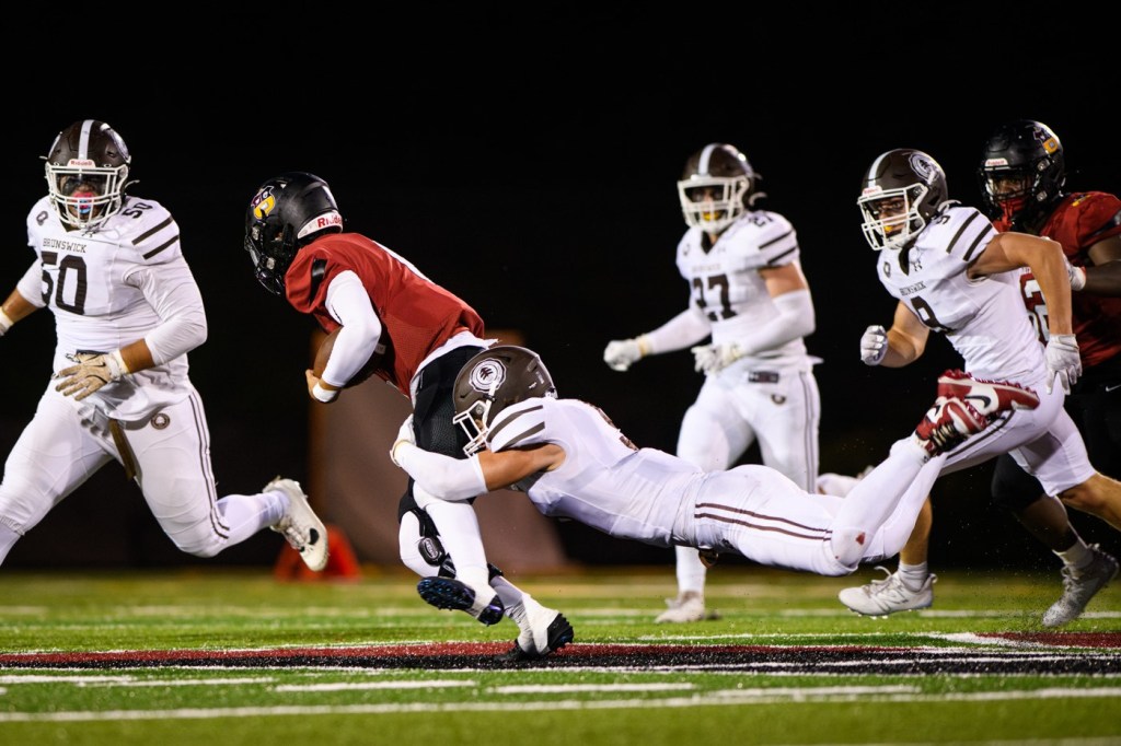 Brunswick started its offense with two field goals off the foot of senior placekicker Oliver Reynolds, who converted 3 of 4 of his field goal attempts for the game. Later in the first quarter, Brunswick senior quarterback/captain Blake Hebert found sophomore wide receiver Noah Park open in the back of the end zone for a 14-yard touchdown pass and Brunswick held a 13-0 lead at the end of the first quarter.