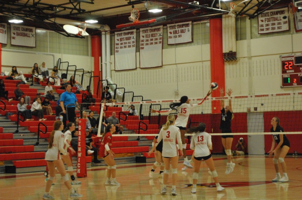 In the fourth game, had the edge most of the time. Muir’s ace gave GHS a 16-14 lead on Southington and the Cards eventually led, 24-20, needing only one point to force a fifth and deciding set. Greenwich thought it had the fourth set won, as it initially took a point, which would have made it 25-23. Yet the point was disallowed due to a questionable infraction called by the official. Southington rallied thereafter and proceeded to win the fourth set, 27-25, and the match.