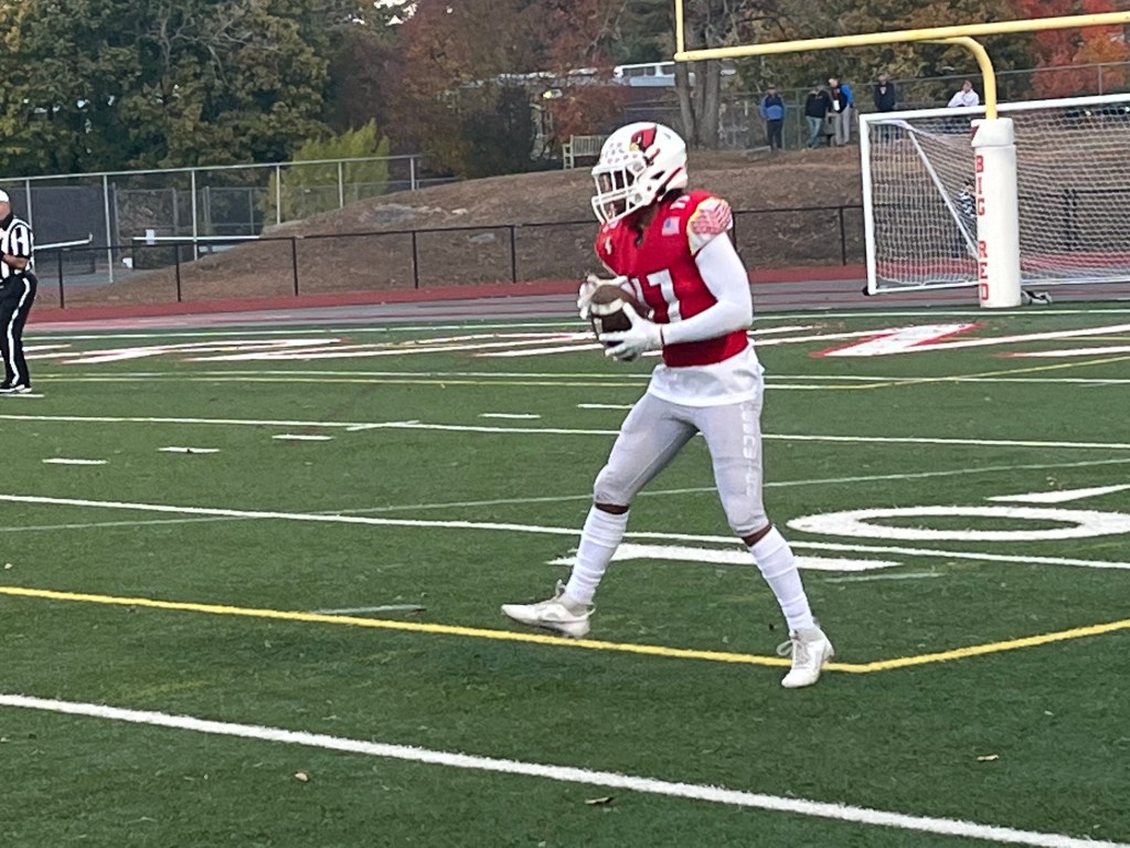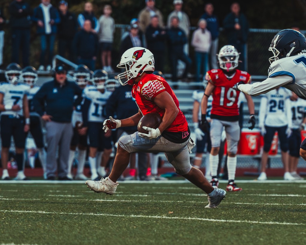 The Cardinals took a four-point advantage at the 5:45 mark of the third quarter. D’Angelo threw a 5-yard scoring strike to senior wide receiver Matthew O’Donnell, capping a 56-yard drive and giving GHS a 17-13 edge. D’Angelo connected with O’Donnell and senior wideout Blake Martin during the scoring drive. On the touchdown, O’Donnell made a nifty leaping catch near the right corner of the end zone while being tightly covered by Wilton junior defensive back Jake Padilla.