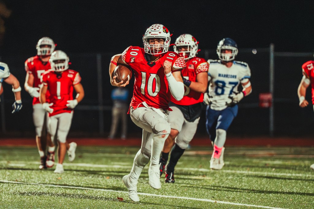 Later in the drive, Hagerty completed a pass to Calabrese, giving the visitors a first down at the Cards’ 17-yard line. Several plays later, Calabrese took an option pitch from Hagerty and sprinted his way around the left side for a 3-yard touchdown. After converting the ensuing PAT, Wilton seized a 20-17 edge with 3:39 to play.