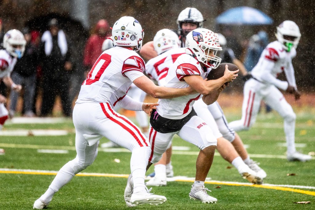 Photo by Dylan Goodman Photography: Hector Lopez of Greenwich takes the handoff from M.J. D’Angelo.