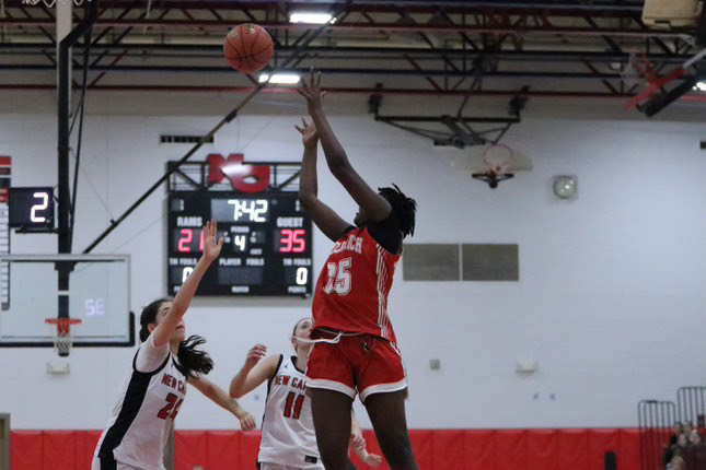 Photo by Dan Utzinger: Greenwich freshman center Zuri Faison takes a shot from close in versus host New Canaan High School on Jan. 17, 2025. The Cardinals posted a 47-27 win.