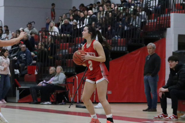 Photo courtesy of Dan Utzinger: Cardinals senior guard Ella Morris looks to pass the ball.