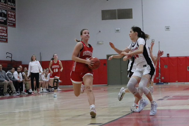 Photo by Dan Utzinger: Greenwich High School junior guard/forward Mikayla Kiernan dribbles toward the basket during a varsity basketball game at New Canaan High School on Jan. 17, 2025, at New Canaan. The Cardinals won the game, 47-27.